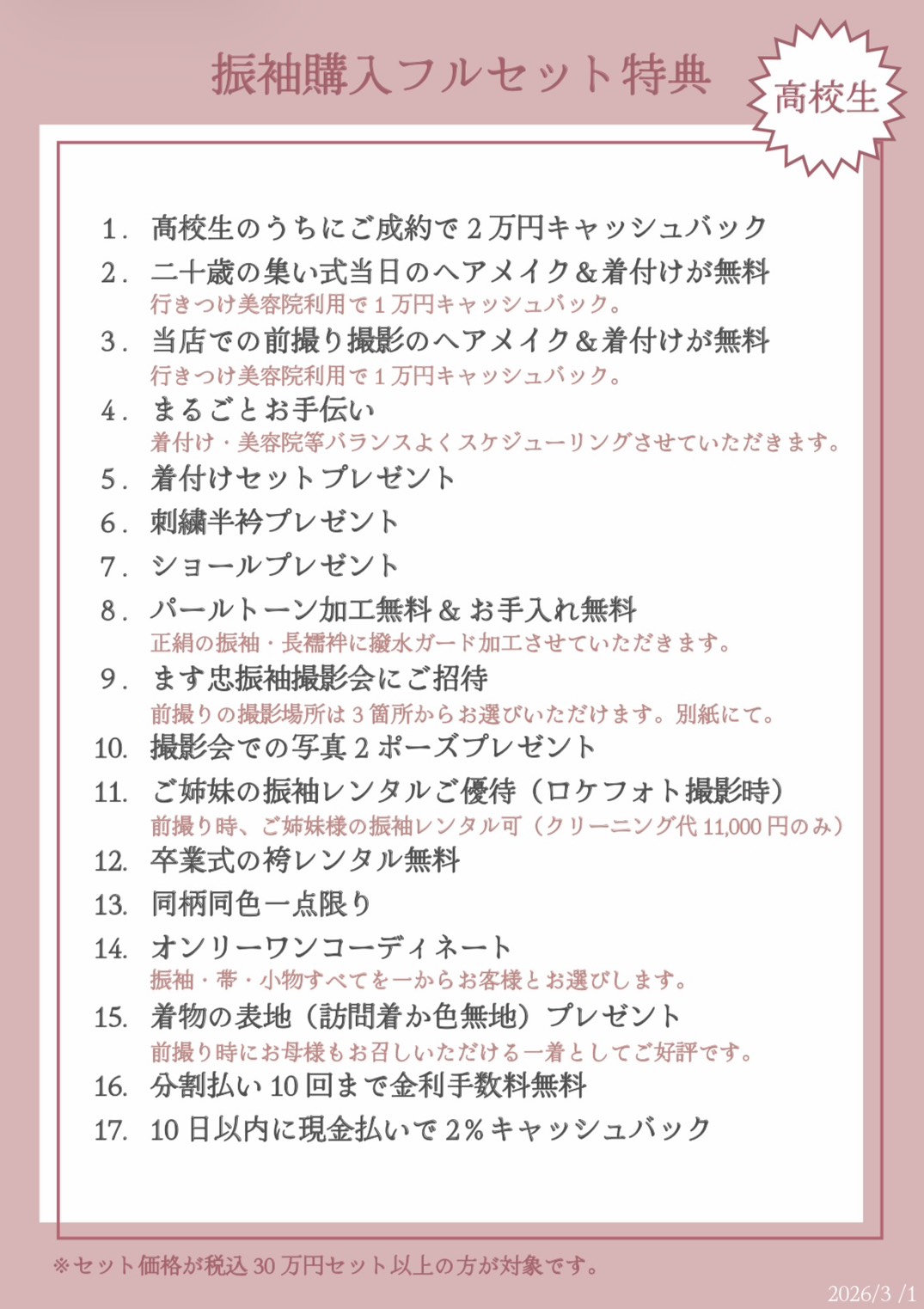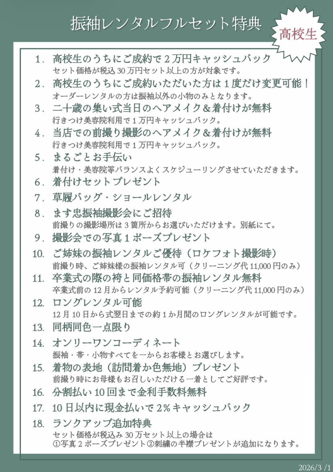3/1から高校生限定振袖特典が増えました!